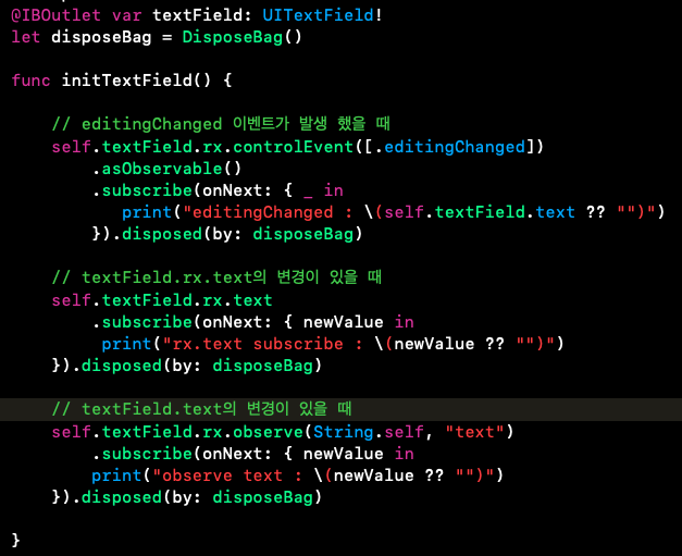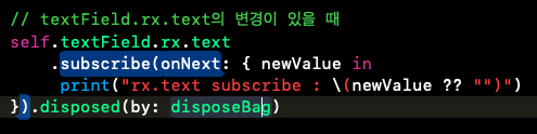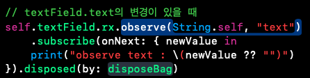 하기 코드를 보면 textField의 property인 text를 구독하고 있다.