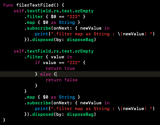 위의 로직들은 textField의 입력된 값이 "222" 으로 변경 되었을 때 "222"를 print해주는 코드다.